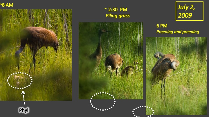 Phyl's death triggered profound changes in activity patterns. Repeatedly throughout the day, each of the cranes walked back to gaze at Phyl's body for several minutes. Several times, one or the other parent dropped pieces of grass on Phyl; then they returned to foraging. At the sun began to set, all three members of the family began to dance with high energy and intensity. This was the first time we had seen Jacques dance. The dance steps included standing and running wingspreads by all three cranes and also a run-flap-glide, a very rare high intensity female display.