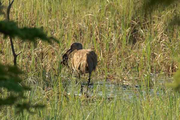 The eggs should have hatched on June 8th, but instead heavy rains fell and we saw no colts. Incubating stopped two days later. But then, both cranes began to pile marsh grasses and underwater weeds from the mucky bottom of the pond onto the nest. This piling continued until on June 14th. By then, the vegetation mound was almost one foot high. This pile caught the attention of ravens, perhaps because it was odorous?