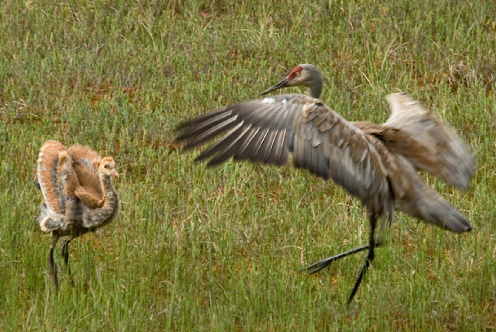 Hastings was precocious. On July 5th, he presented a Droop-wing Threat display toward a squirrel. Also on that day, he began to dance with his parents. In his initial dance attempts, he fell down (see "One month old Sandhill" video) and remained a little timid for the next week but resumed dancing and flight school practice with vigor.